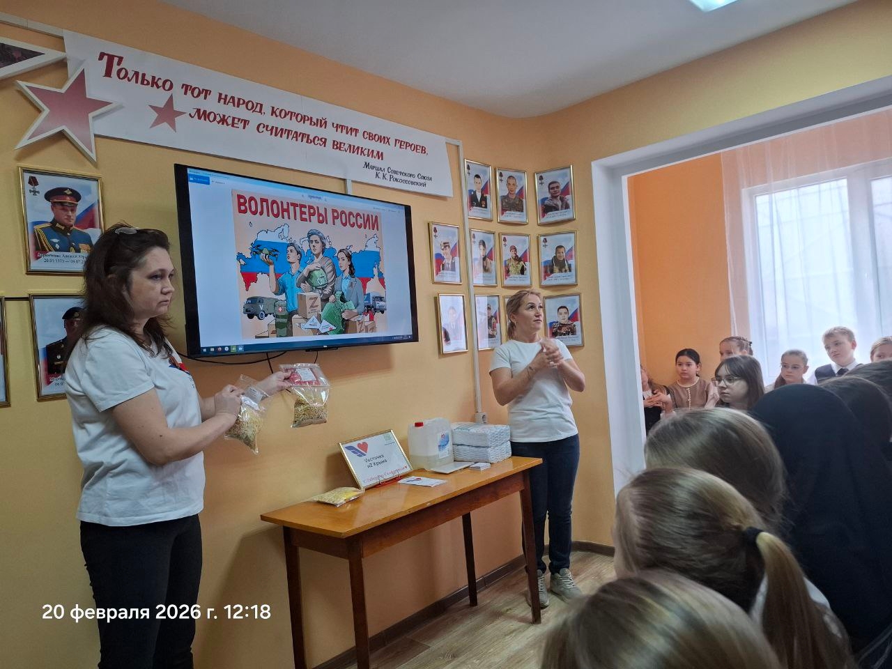Гости, волонтёры организации "Весточка из Крыма", рассказали о своей работе - вяжут тёплые носки и жилеты, изготавливают продукты питания - сухие пайки, консервацию, домашнюю выпечку и отправляют на фронт. Сотрудники библиотеки продемонстрировали ребятам видеосюжеты о волонтёрам России. Волонтёры научили ребят как собирать пакет армейского сухого душа.