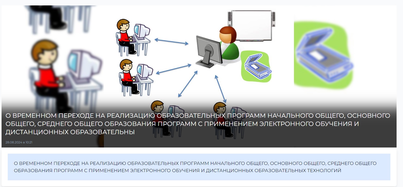 О ВРЕМЕННОМ ПЕРЕХОДЕ НА РЕАЛИЗАЦИЮ ОБРАЗОВАТЕЛЬНЫХ ПРОГРАММ НАЧАЛЬНОГО ОБЩЕГО, ОСНОВНОГО ОБЩЕГО, СРЕДНЕГО ОБЩЕГО ОБРАЗОВАНИЯ ПРОГРАММ С ПРИМЕНЕНИЕМ ЭЛЕКТРОННОГО ОБУЧЕНИЯ И ДИСТАНЦИОННЫХ ОБРАЗОВАТЕЛЬНЫХ ТЕХНОЛОГИЙ С 04.09 ПО 06.09.2024 Г.